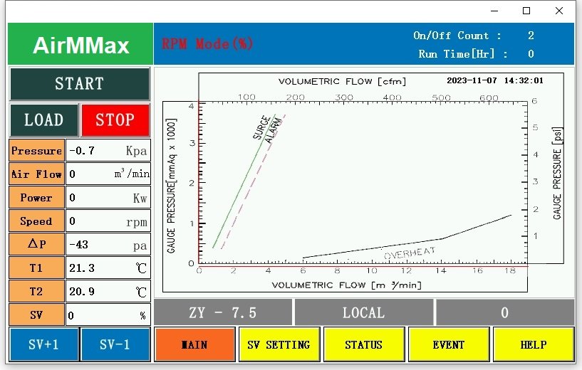 AirMMax turbo blower is operated by the touch screen to adjust frequency and reach required air flow and pressure.